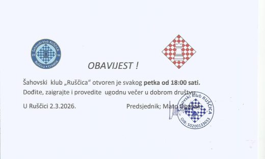 OBAVIJEST ! Šahovski klub „Ruščica“ otvoren je svakog petka od 18:00 sati. Dođite, zaigrajte i provedite ugodnu večer u dobrom društvu. U Ruščici 2.3.2026. Predsjednik; Mato Opačak